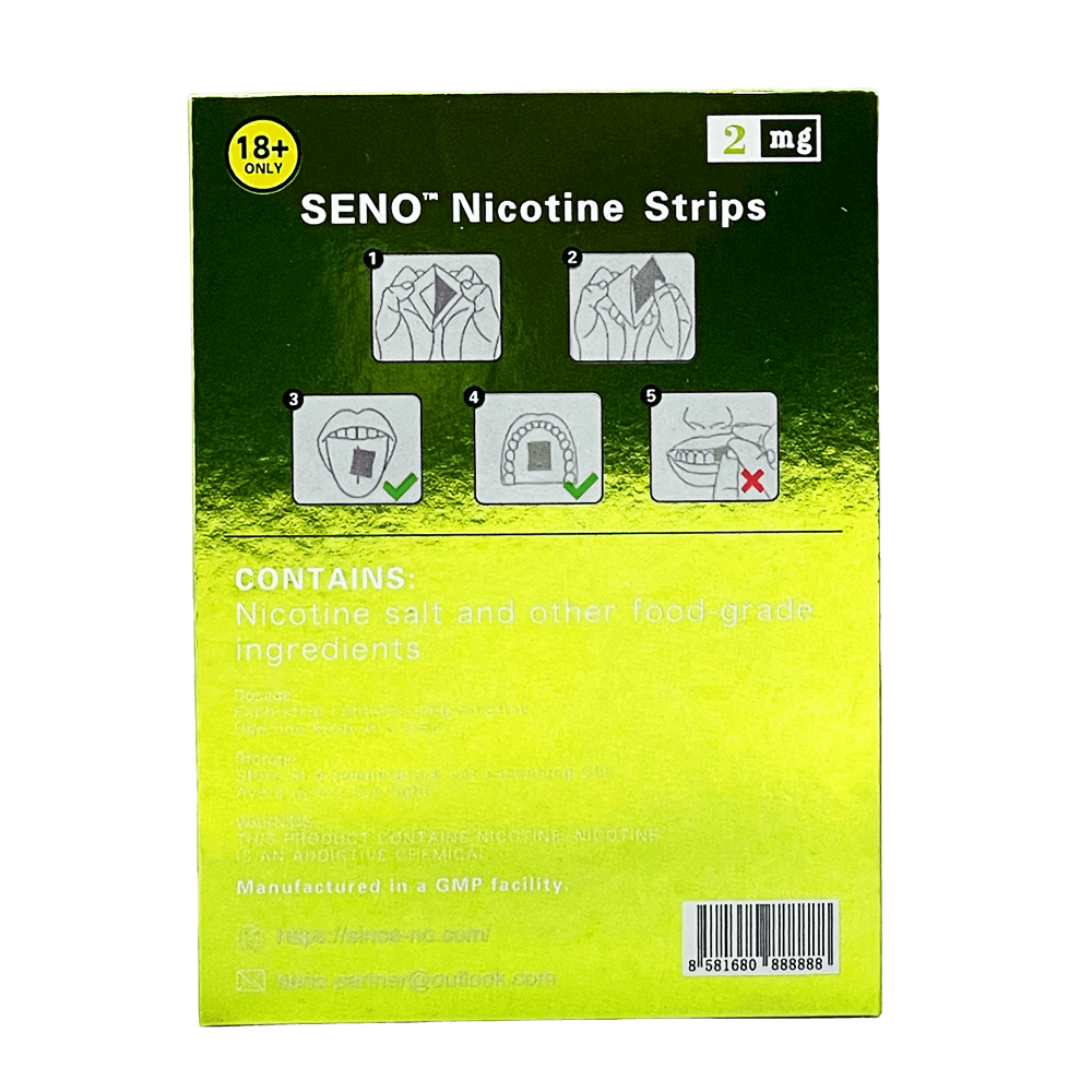 A: SENO Lemon Ice nicotine strips contain 2mg of nicotine per strip. Don’t let the 2mg fool you — because the strip dissolves directly on your tongue, nicotine is absorbed rapidly through the oral mucosa, delivering a noticeably faster and more efficient hit compared to traditional pouches or gum at similar strengths.